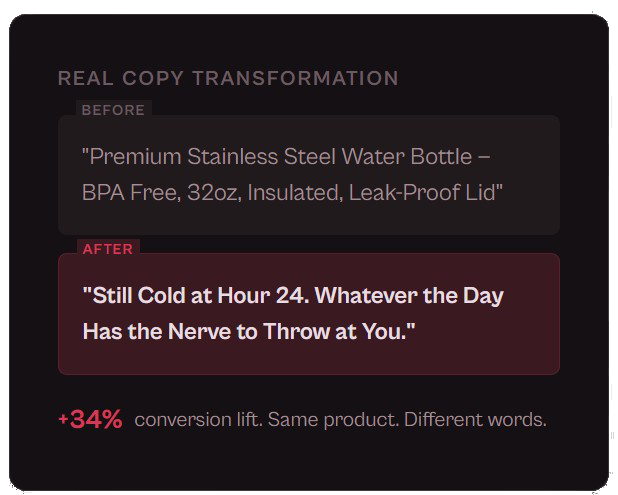 Your product is great. Your current copy is doing it dirty. I write product pages, email flows, and homepage copy that bypasses the overthinking cortex and hits the part of the brain that actually buys things.